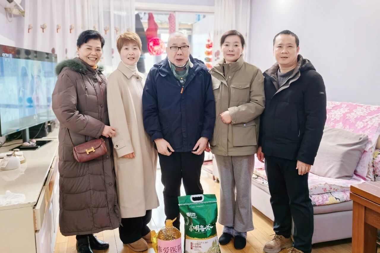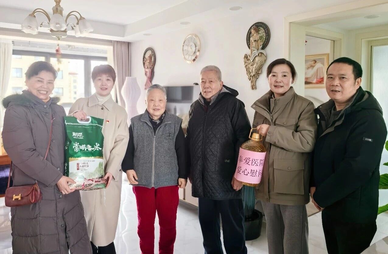 此次慰问活动由上海奉爱医院院长陶培丽(左起第二位)、工会主席詹主任(右起第一位),奉城镇第六居委会张书记(左起第一位),俏霞韵艺术团李致霞(右起第二位)带队,一行人带着精心筹备的慰问物资与诚挚的新春祝福,先后走访慰问了辖区5户困难家庭,与他们面对面交流、心贴心沟通,详细询问家庭生活近况、身体状况及实际困难,倾听他们的心声与诉求,为他们送去冬日里的关怀与慰藉。